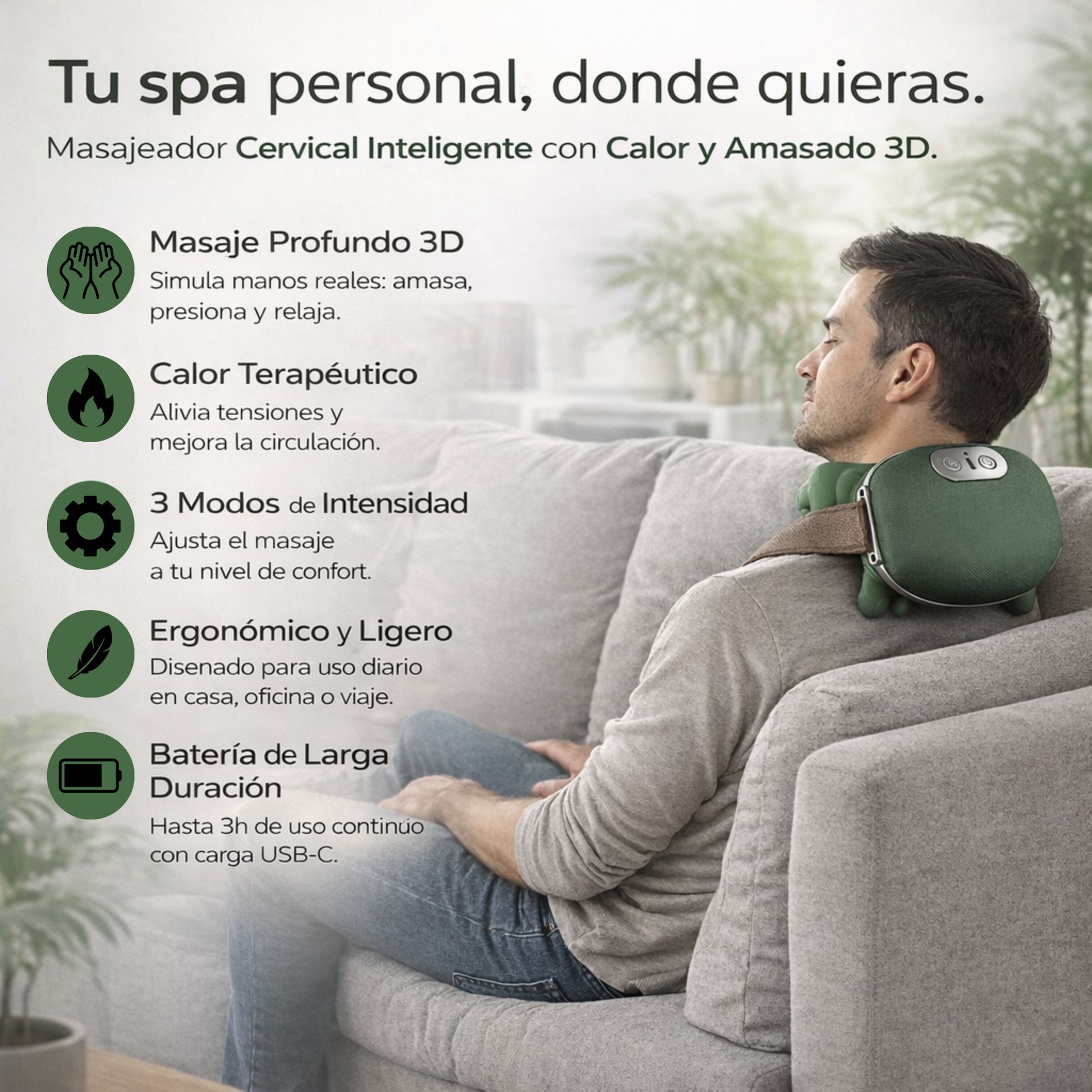 - 🖐️ Amasado 3D tipo manos reales que libera cuello, hombros y espalda con movimientos precisos.